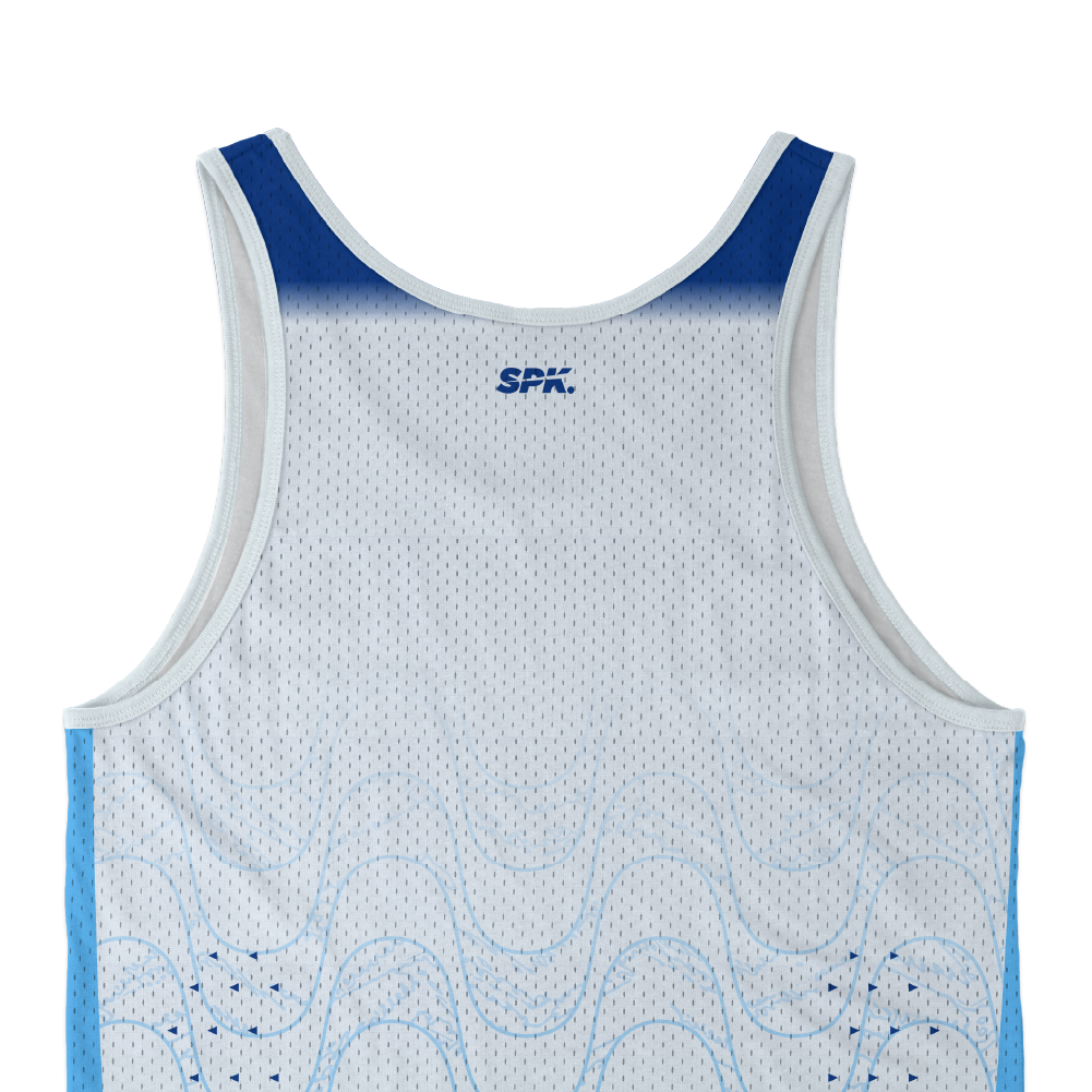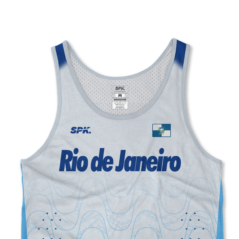 O design exclusivo combina o branco, azul marinho e azul claro, em um visual moderno, limpo e cheio de identidade. O destaque especial fica para as ondas do Calçadão de Copacabana, eternizadas como símbolo da cidade maravilhosa e agora estampadas na regata com muito estilo. Além disso, ela traz o nome “Rio de Janeiro” no peito, reforçando a ideia de união, pertencimento e orgulho de carregar o nome do estado em cada corrida.